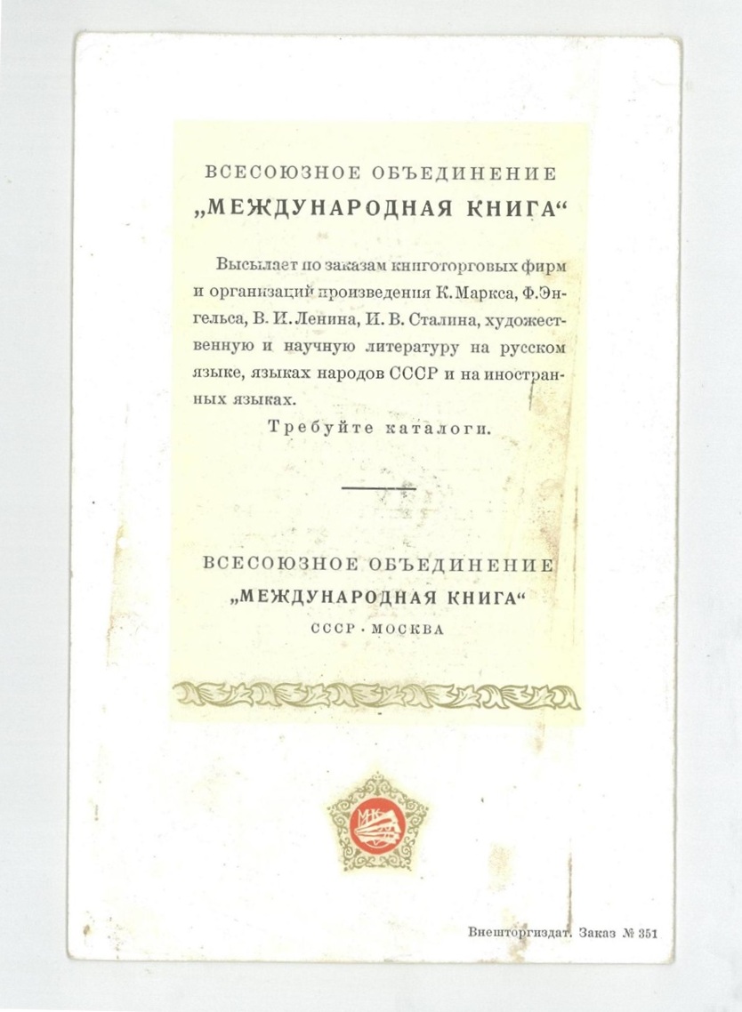可根据图书销售公司和组织的订单,寄送用俄语、苏联各民族语言和各种外语写成的卡·马克思、弗·恩格斯、弗·伊·列宁、约·维·斯大林的著作,以及文学作品和科学文献。