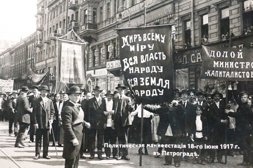 Manifestación política el 18 de junio de 1917 en Petrogrado. La bandera izquierda dice "Paz para el mundo entero - Todo el poder al pueblo - Toda la tierra al pueblo " y la bandera derecha dice: "Abajo los ministros capitalistas"; éstas eran consignas bolcheviques. |