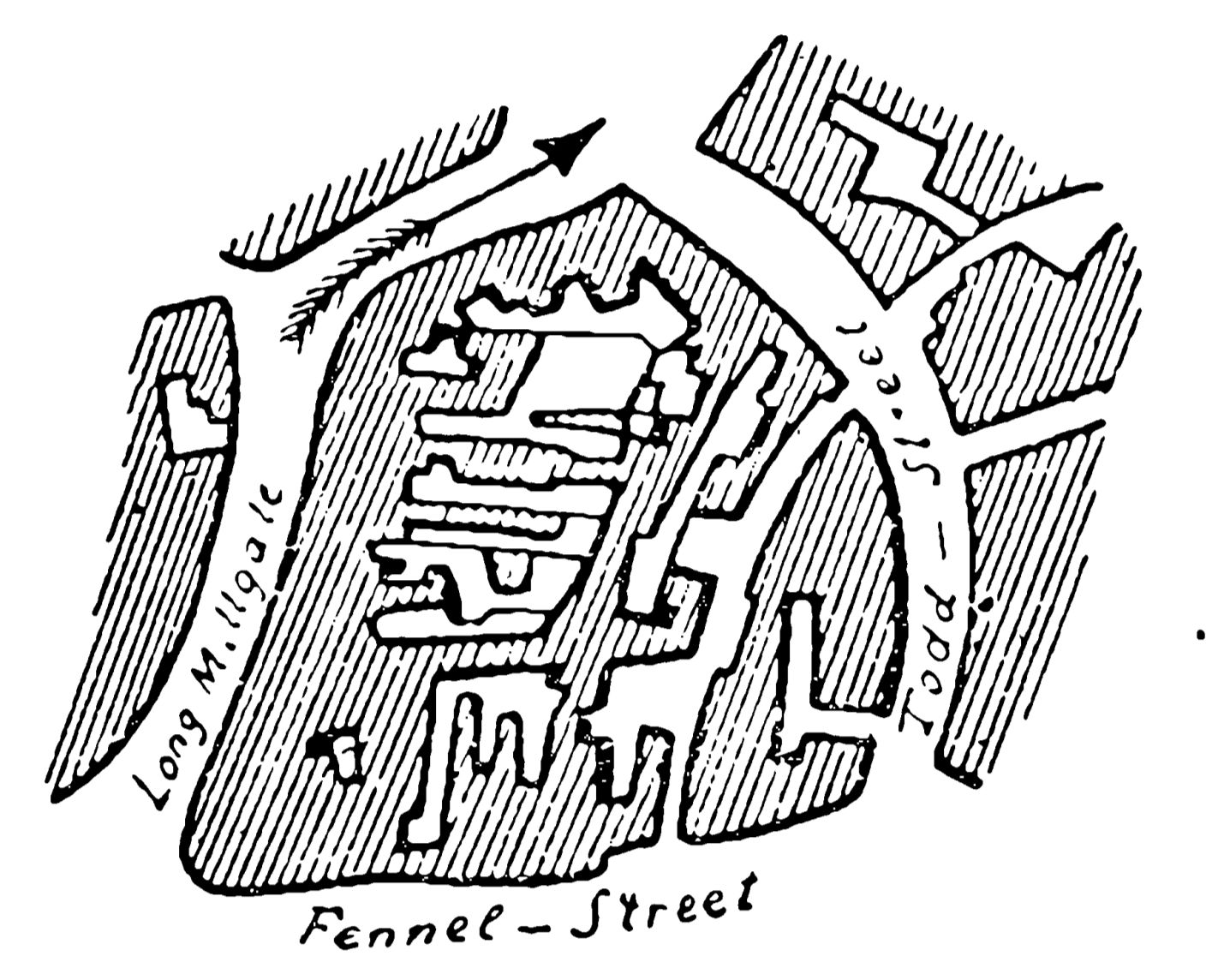Még csak azt említem meg, hogy a gyárak majdnem kivétel nélkül a három folyó és a várost átszelő különböző csatornák mentén épültek, s áttérek a munkásnegyedek leírására. Itt van mindenekelőtt Manchester óvárosa, amely a kereskedelmi negyed északi határa és az Irk között terül el. Utcái, még a jobbak is, szűkek és görbék — mint a Todd Street, Long Millgate, Withy Grove és Shude Hill —, házai piszkosak, régiek, düledezők, a mellékutcák építési módja förtelmetes. Ha az öreg templomtól a Long Millgate-re megyünk, mindjárt jobbra egész sor régimódi házat találunk, amelyek homlokzata kivétel nélkül elferdült; ezek a régi, az iparosodás előtti Manchester maradványai; korábbi lakóik utódaikkal együtt jobban épült kerületekbe költöztek, és házaikat, amelyek már nem feleltek meg nekik, egy erősen ír vérrel keveredett munkásrétegnek adták át. Itt valóban csaknem leplezetlen munkásnegyedben vagyunk, mert még az utcai üzletek és csapszékek tiszta külsejére sem fordítanak gondot. De ez még semmi ahhoz képest, amit a mögöttük levő sikátorokban és udvarokban látunk. Ide csak szűk, fedett folyosókon lehet bejutni, amelyekben ketten sem férnek el egymás mellett. Leírhatatlan a házaknak az a rendetlen, minden ésszerű építészetet kigúnyoló összevisszasága, zsúfoltsága, ahogyan itt a szó szoros értelmében egymáshoz vannak préselve. És ennek nemcsak a régi Manchesterből visszamaradt épületek az okai; ez az összevisszaság csak az újabb időben érte el tetőfokát, mert ami kis területet az előbbi kor építészete még meghagyott, később beépítették, kifoldozták, annyira, hogy a házak között végül tenyérnyi üres, beépíthető hely sem maradt. Ennek igazolására lerajzolom Manchester térképének egy kis részét, amely az óvárosnak nem a legrosszabb darabja és nem egészen a tizedrésze.