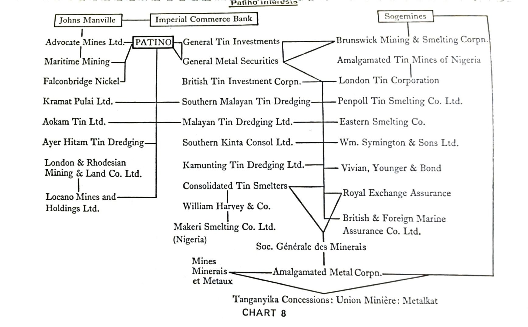The tin empire of Patino of Canada Ltd. and its associates spreads from South America to the United Kingdom and North America and across Africa into the Pacific and Asia. Capitalised at $10 million, Patino of Canada has issued and paid up 1,971,839 shares of $2. Of these 47·2 per cent are held by a Panamanian financing house within the Patino group, Compania de Bonos Acciones y Negocios Industriales – COBANISA. Patino’s purchase into General Tin Investments Ltd. in 1962 brought this tycoon into a large share of the United Kingdom spread in the tin-mining and dealing world. General Tin Investments is charged with acquiring and holding shares in mining, finance and industrial companies, its principal holdings being in those companies connected with the tin industry. It carries out its financing operations through a wholly-owned subsidiary, General Metal Securities (London) Ltd. A. Patino presides over both boards where he has as colleagues Count G. du Boisbouvray, J. Ortiz-Linares and E. R. E. Carter. Carter is president of Brunswick Mining & Smelting Corporation and of several other companies associated with the Patino group. Brunswick comes within the Morgan sphere of influence through the interest maintained by St Joseph Lead Co. We also know that Sogemines has concerned itself with a substantial investment with the New Brunswick Mines of Brunswick Mining. The spokes that lead out from the Société Générale de Belgique’s African hub into the affairs of the most powerful financial monopolies in the world seem ever-increasing.